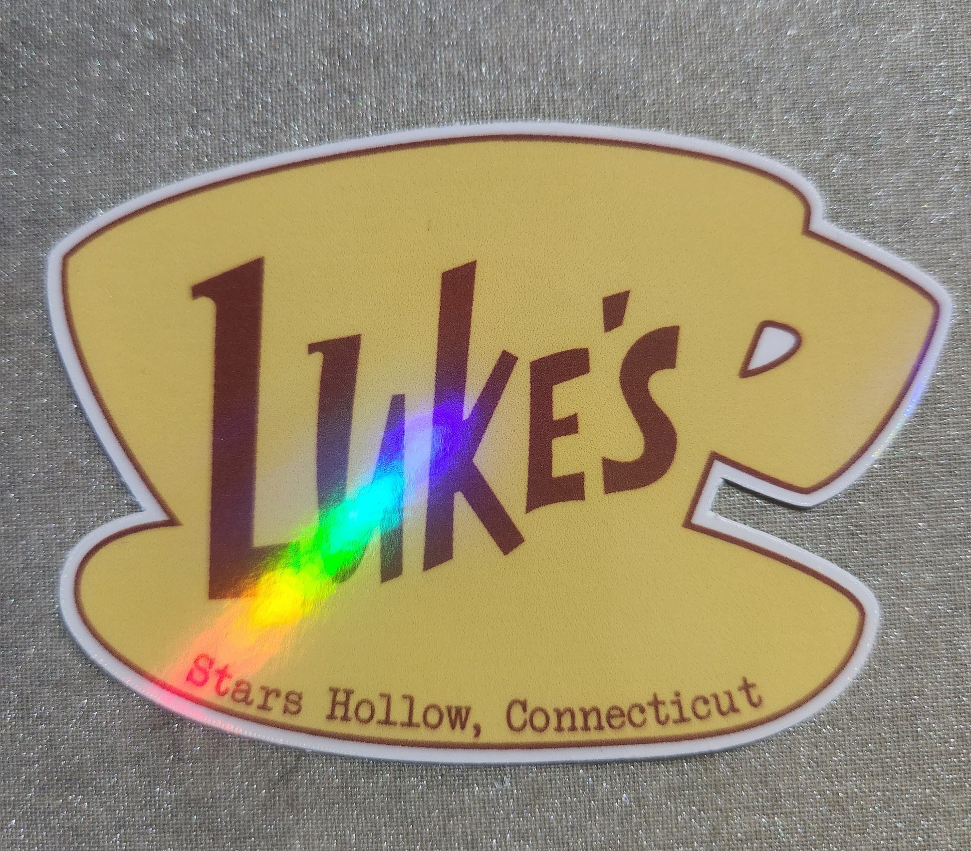 Holographic vinyl sticker approx. 3.3 inches wide.